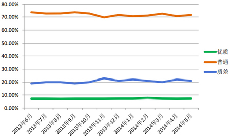 2、從近一年的評估數(shù)據(jù)中我們發(fā)現(xiàn),優(yōu)質(zhì)網(wǎng)頁的絕對數(shù)量非常少,且?guī)缀鯖]有增長;普通網(wǎng)頁的占比在下降,相應(yīng)的,質(zhì)差網(wǎng)頁的比例卻有明顯上漲。