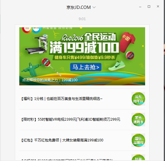 京東微信公眾號 這是京東微信公眾號的營銷,通過綠色和各種運動器材的組合營造出了奧運的氣氛,仔細(xì)看看左下角,“點擊釋放你的洪荒之力”的文案,又成功貼上了奧運熱詞。右側(cè)的小圖全是綠色,可算是把顏色玩的很溜啊。