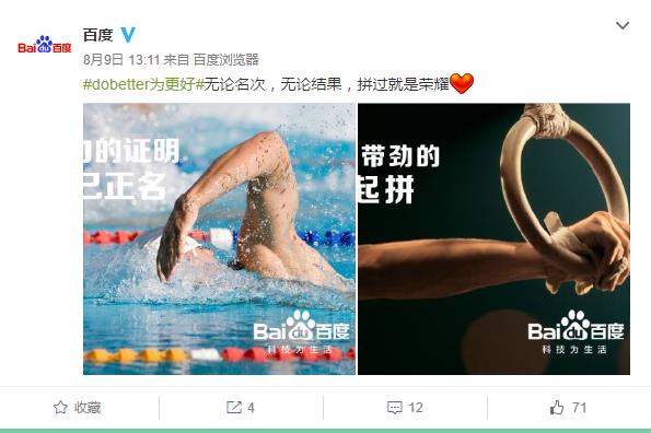 百度 百度的這條微博,話題是#dobetter為更好#乍看跟奧運沒有絲毫的關(guān)系,可配上“無論名次。無論結(jié)果,拼過就是榮耀”的文案以及兩張運動員運動時身體局部的截圖,就輕松地營造了奧運的氣氛。