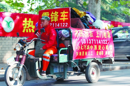 “雷鋒哥”孫德坤,河南周口扶溝縣人,20多年來一直堅持慈善事業(yè)。每天,都能看見孫德坤的電動三輪車“雷鋒車”穿梭于鄭州的大街小巷,將市民捐獻的各種物資送到需要幫助的環(huán)衛(wèi)工、農(nóng)民工、流浪人員手中。